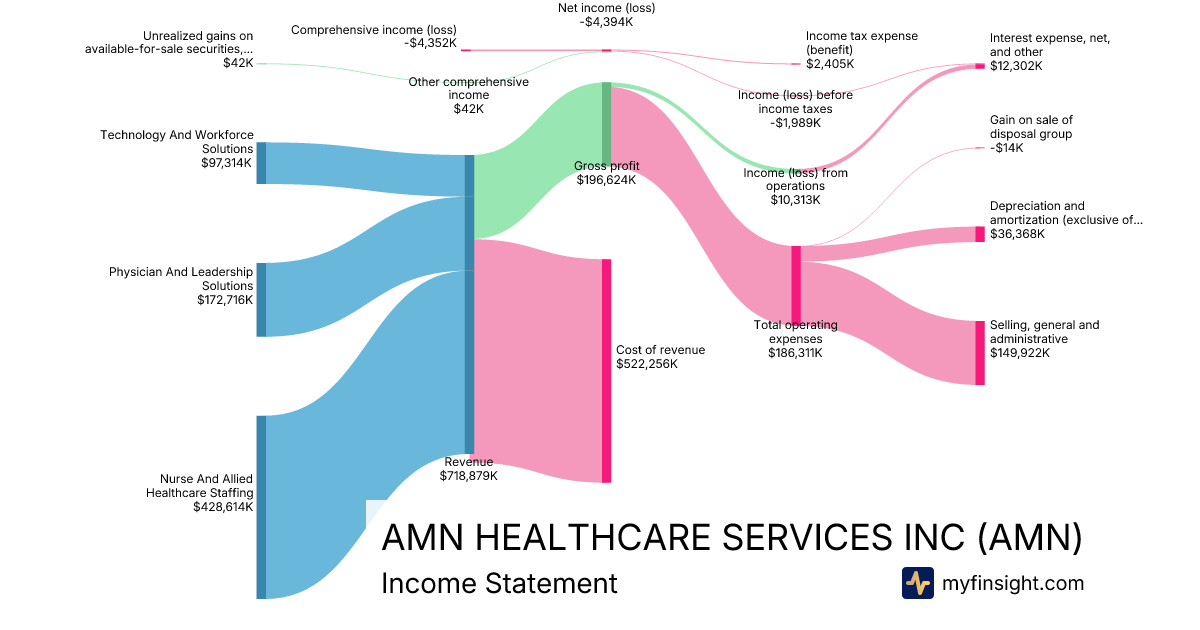 For the year ending 2025-12-31, AMN made $2,730,429K in revenue. -$95,393K in net income. Net profit margin of -3.49%.