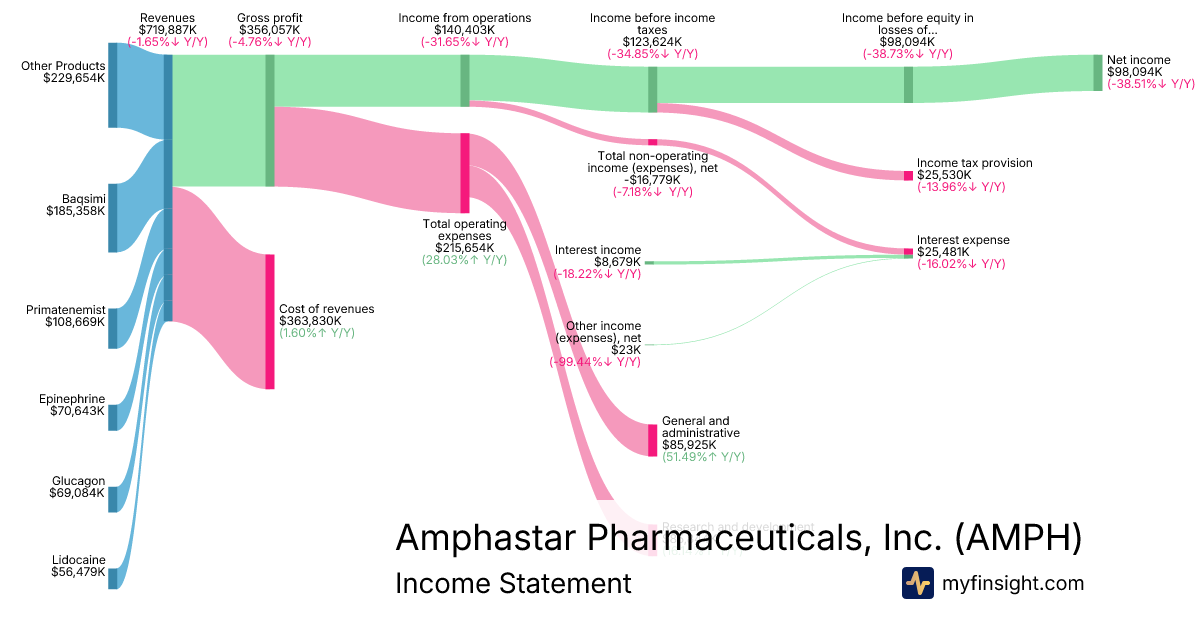 For the year ending 2025-12-31, AMPH made $719,887K in revenue. $98,094K in net income. Net profit margin of 13.63%.