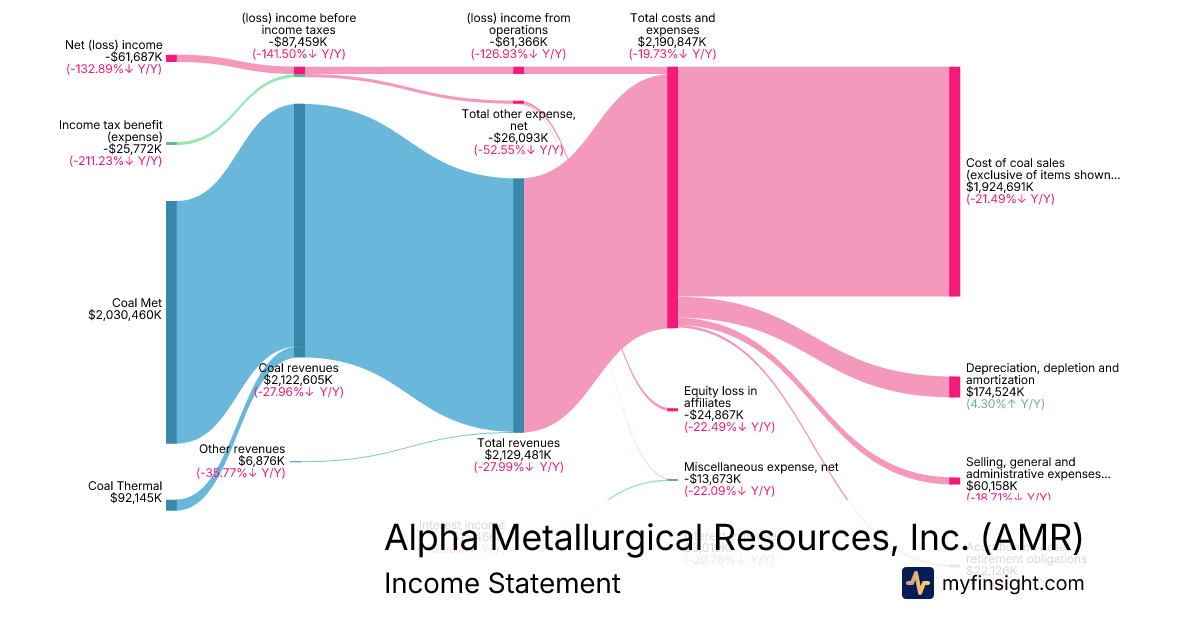 For the year ending 2025-12-31, AMR made $2,129,481K in revenue. -$61,687K in net income. Net profit margin of -2.90%.