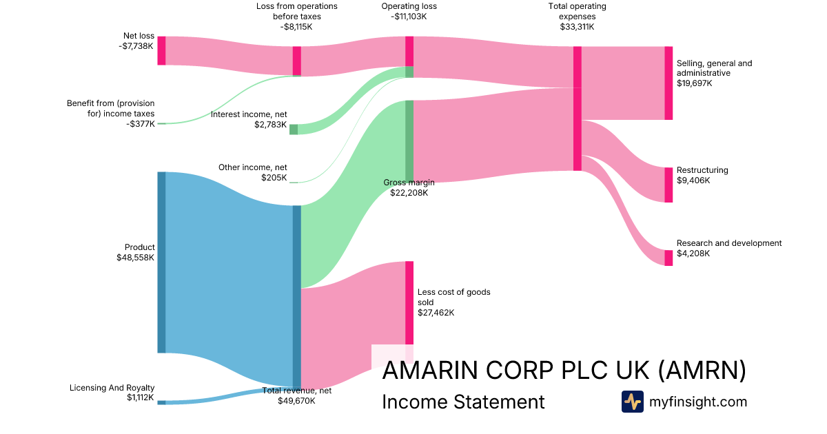 For the quarter ending 2025-09-30, AMRN made $49,670K in revenue. -$7,738K in net income. Net profit margin of -15.58%.
