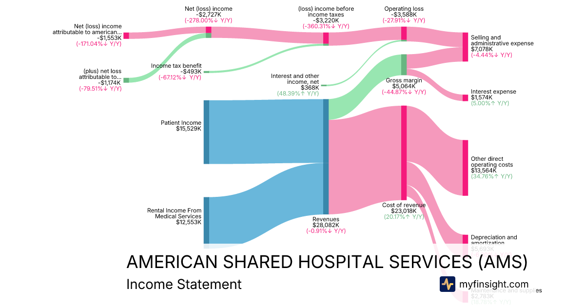 For the year ending 2025-12-31, AMS made $28,082K in revenue. -$1,553K in net income. Net profit margin of -5.53%.