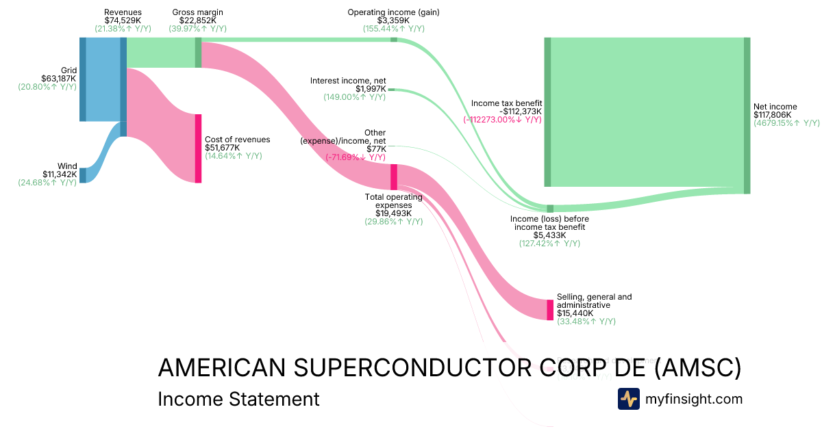 For the quarter ending 2025-12-31, AMSC made $74,529K in revenue. $117,806K in net income. Net profit margin of 158.07%.