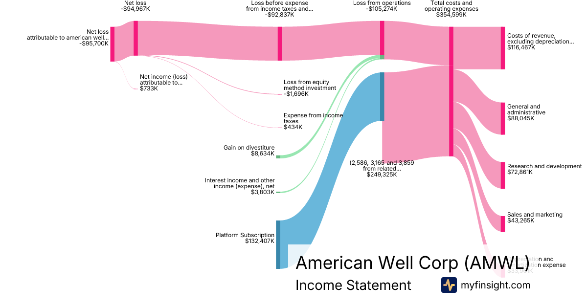 For the year ending 2025-12-31, AMWL made $249,325K in revenue. -$95,700K in net income. Net profit margin of -38.38%.
