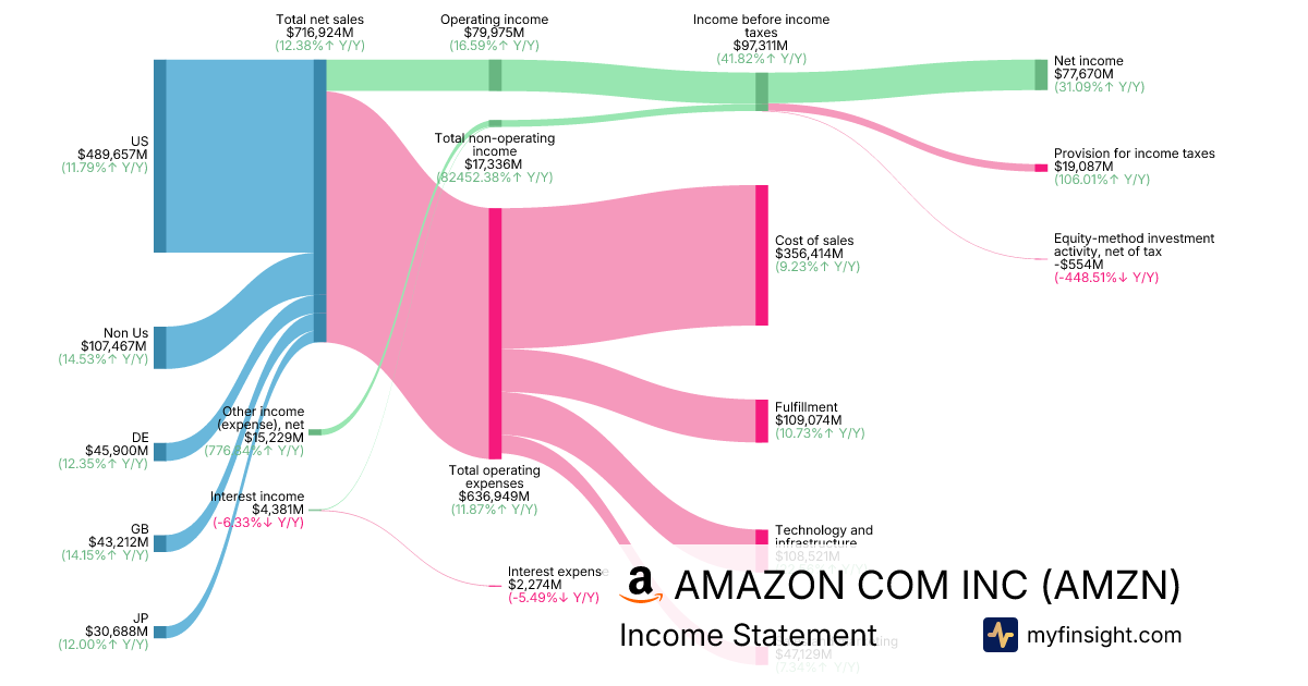 For the year ending 2025-12-31, AMZN made $716,924M in revenue. $77,670M in net income. Net profit margin of 10.83%.