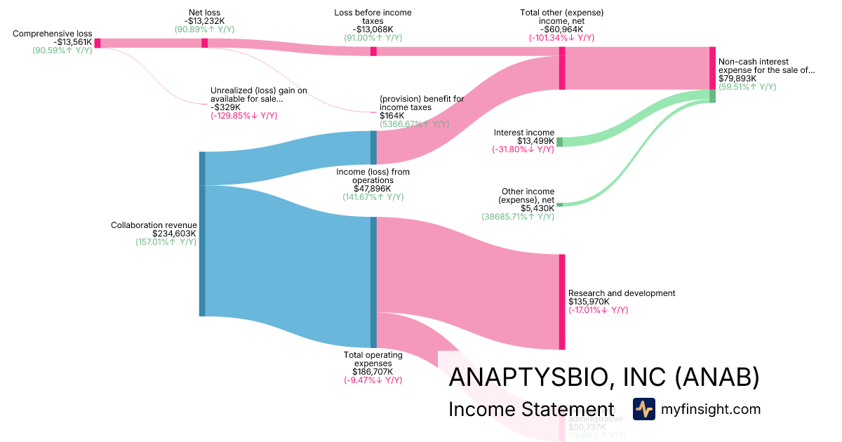 For the year ending 2025-12-31, ANAB made $234,603K in revenue. -$13,561K in net income. Net profit margin of -5.78%.