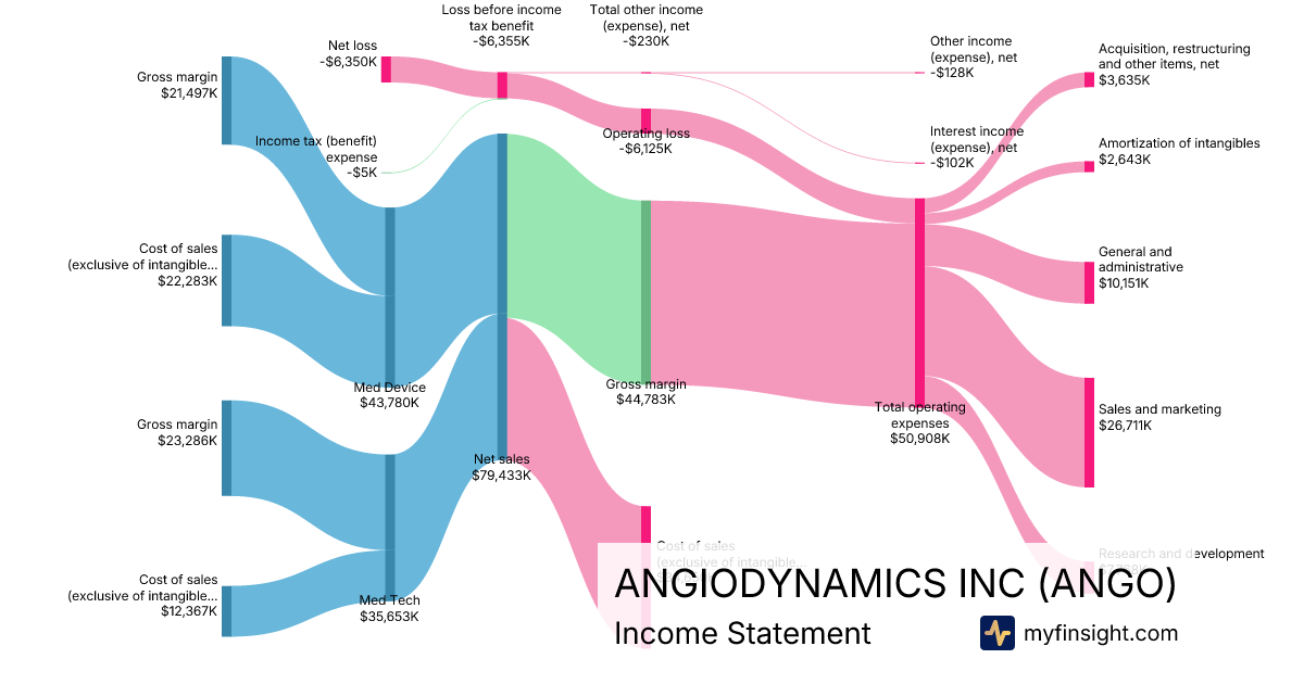 For the quarter ending 2025-11-30, ANGO made $79,433K in revenue. -$6,350K in net income. Net profit margin of -7.99%.