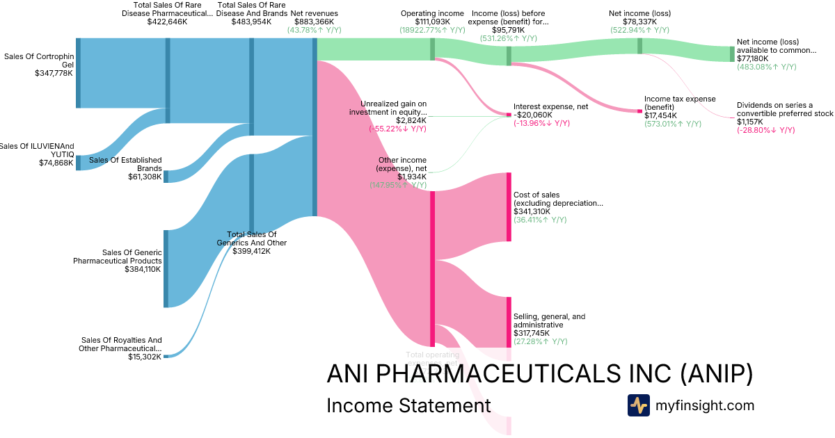 For the year ending 2025-12-31, ANIP made $883,366K in revenue. $77,180K in net income. Net profit margin of 8.74%.