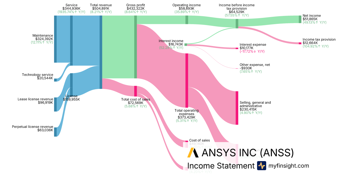 For the quarter ending 2025-03-31, ANSS made $504,891K in revenue. $51,865K in net income. Net profit margin of 10.27%.