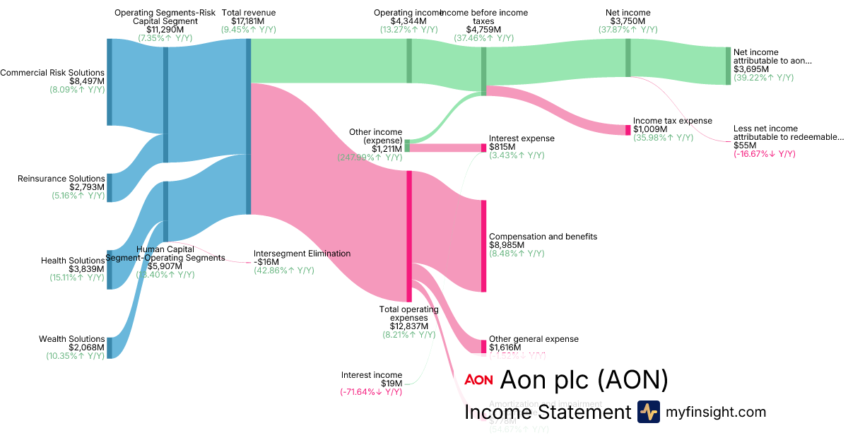 For the year ending 2025-12-31, AON made $17,181M in revenue. $3,695M in net income. Net profit margin of 21.51%.