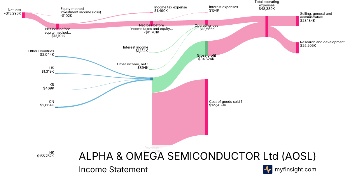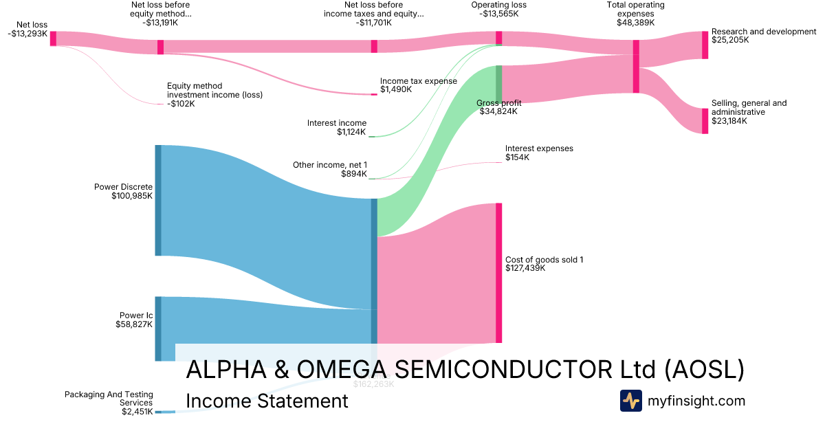 For the quarter ending 2025-12-31, AOSL made $162,263K in revenue. -$13,293K in net income. Net profit margin of -8.19%.