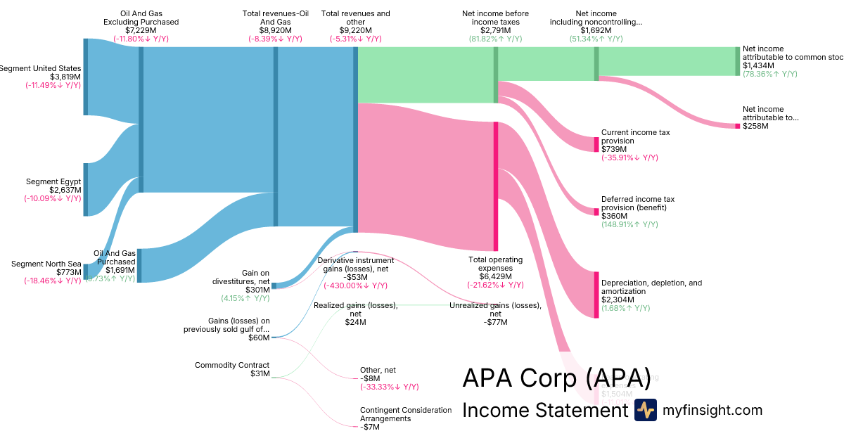 For the year ending 2025-12-31, APA made $9,220M in revenue. $1,434M in net income. Net profit margin of 15.55%.