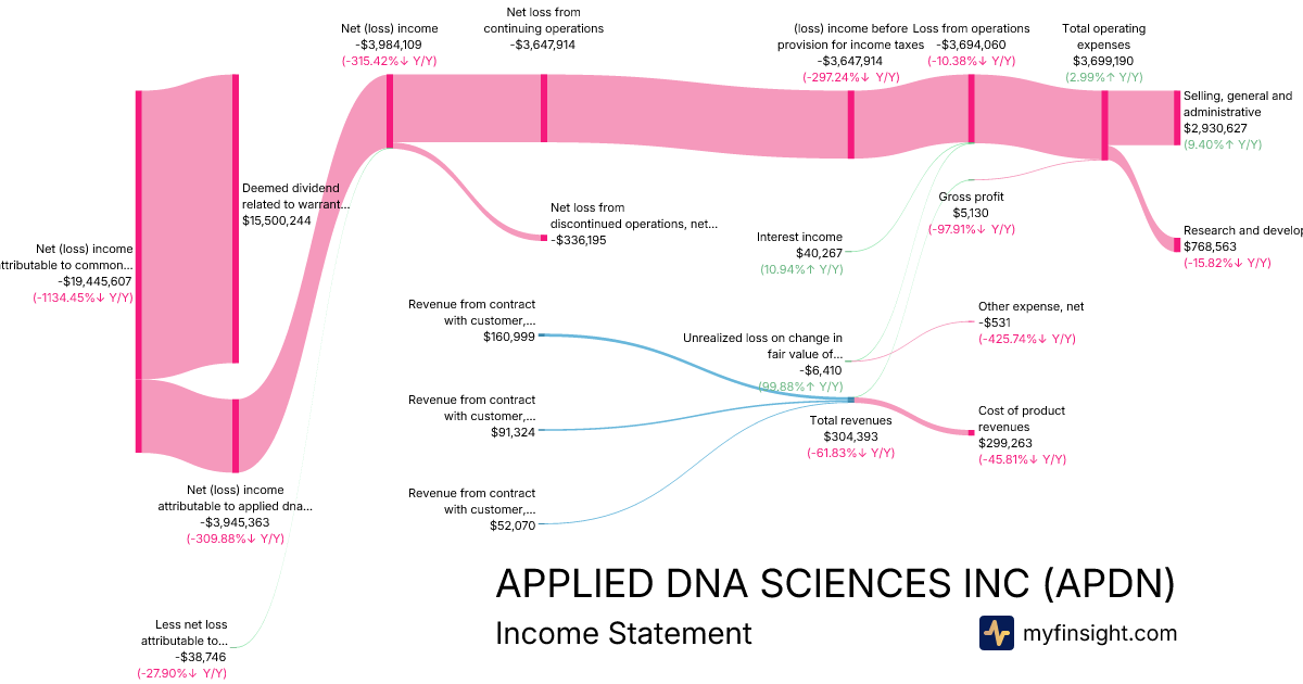 For the quarter ending 2025-06-30, APDN made $304,393 in revenue. -$19,445,607 in net income. Net profit margin of -6388.32%.