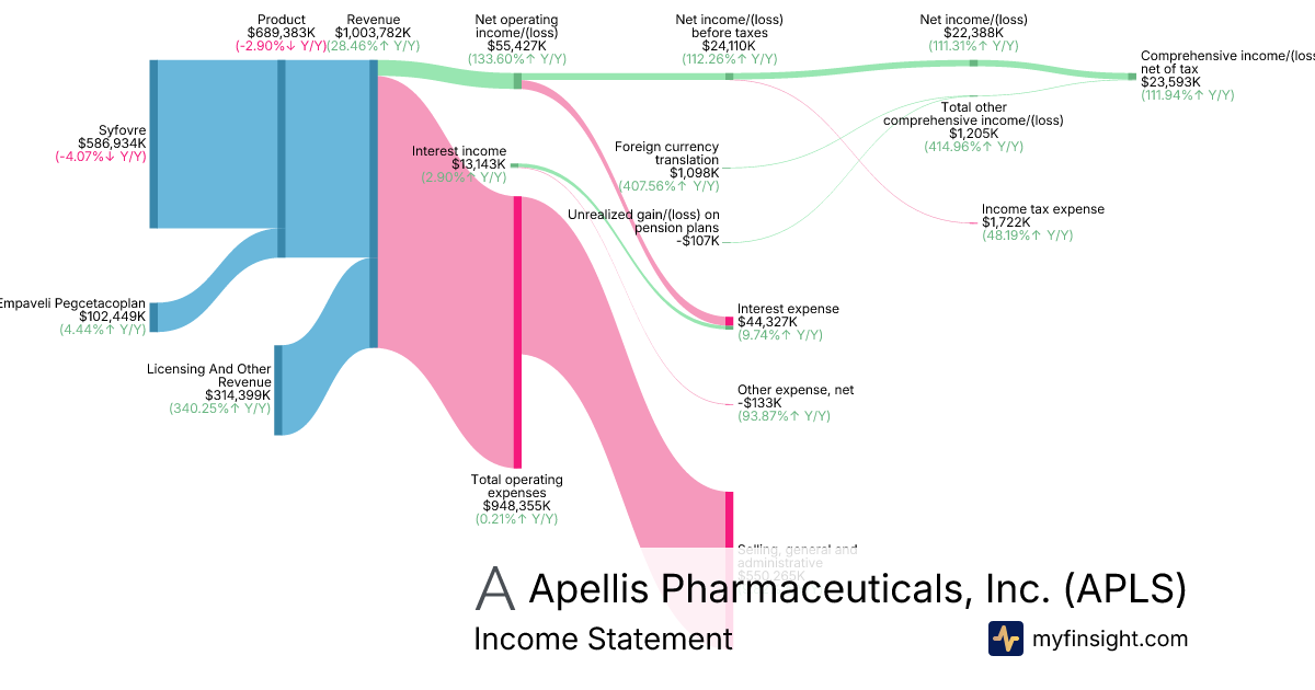 For the year ending 2025-12-31, APLS made $1,003,782K in revenue. $23,593K in net income. Net profit margin of 2.35%.