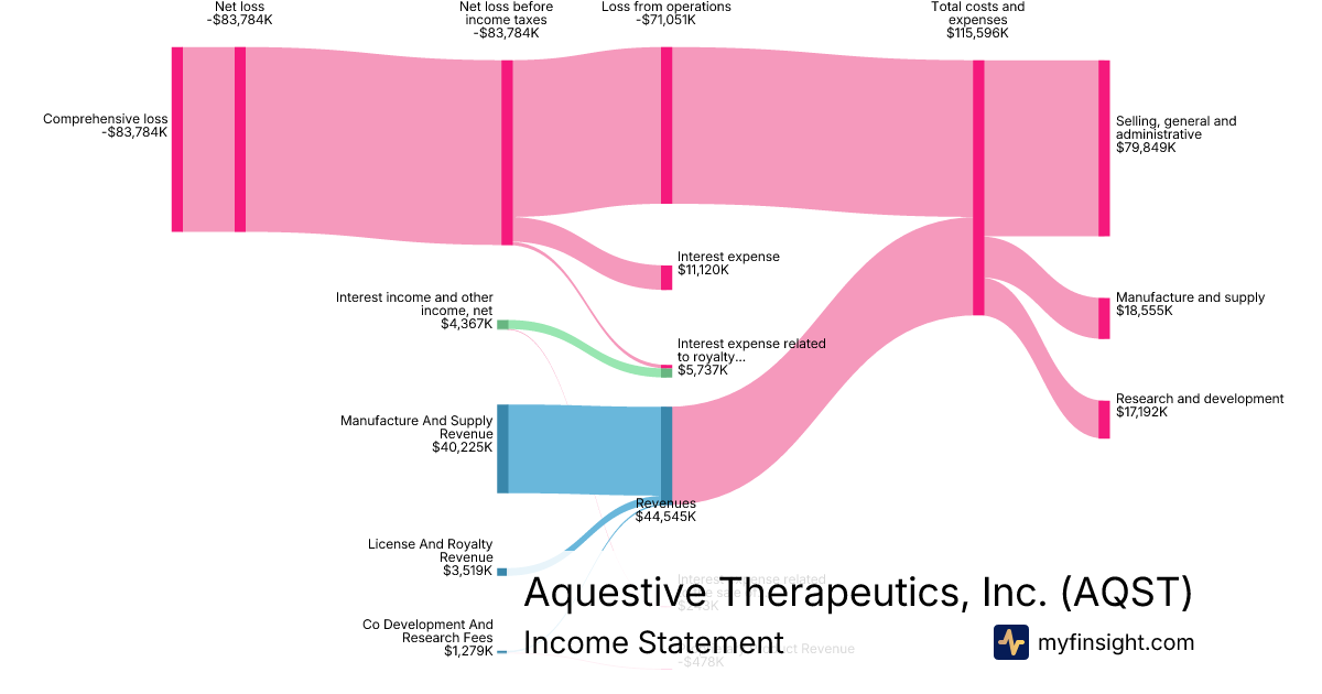 For the year ending 2025-12-31, AQST made $44,545K in revenue. -$83,784K in net income. Net profit margin of -188.09%.