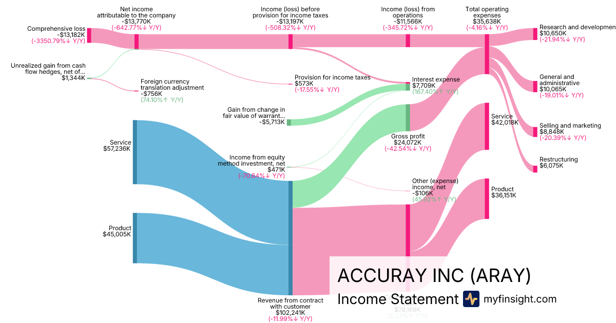 For the quarter ending 2025-12-31, ARAY made $102,241K in revenue. -$13,182K in net income. Net profit margin of -12.89%.