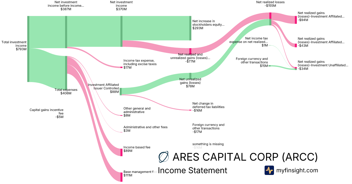 For the year ending 2025-12-31, ARCC made $4,868M in revenue. $1,299M in net income. Net profit margin of 26.68%.