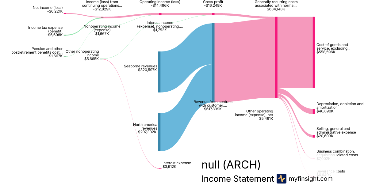 For the quarter ending 2024-09-30, ARCH made $617,899K in revenue. -$6,221K in net income. Net profit margin of -1.01%.