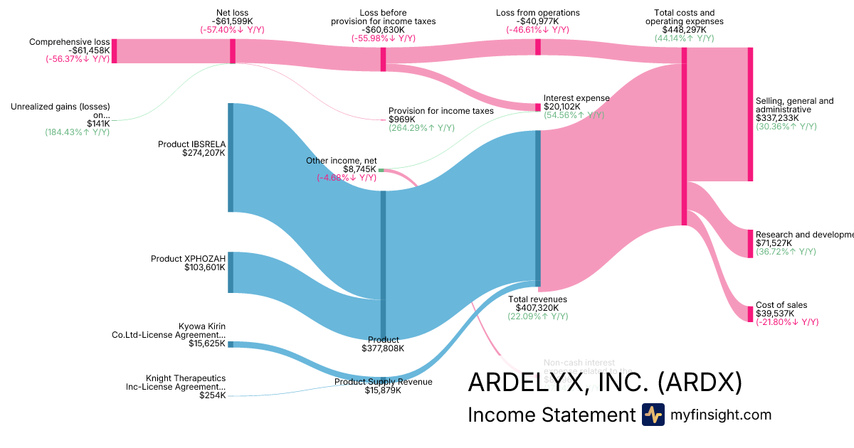 For the year ending 2025-12-31, ARDX made $407,320K in revenue. -$61,458K in net income. Net profit margin of -15.09%.