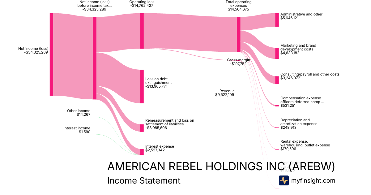 For the year ending 2025-12-31, AREBW made $9,522,109 in revenue. -$34,325,289 in net income. Net profit margin of -360.48%.
