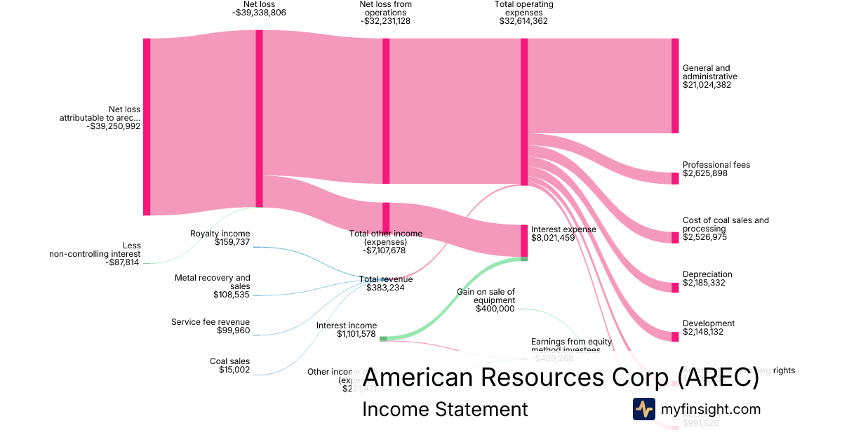 For the year ending 2024-12-31, AREC made $383,234 in revenue. -$39,250,992 in net income. Net profit margin of -10242.04%.
