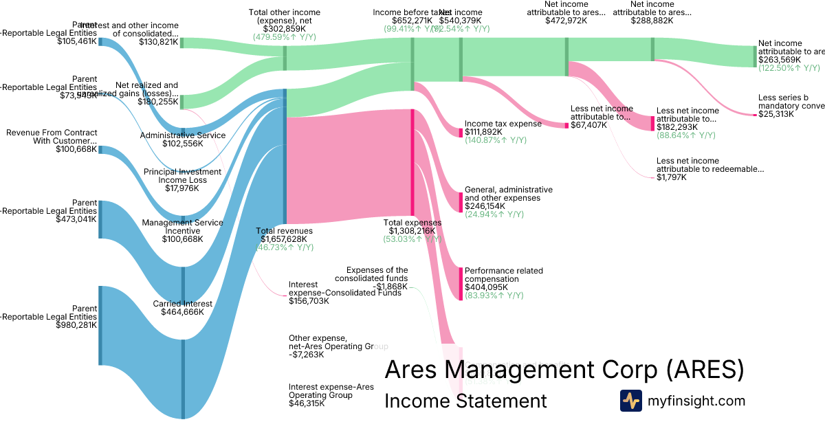 For the quarter ending 2025-09-30, ARES made $3,480,852K in revenue. $263,569K in net income. Net profit margin of 7.57%.
