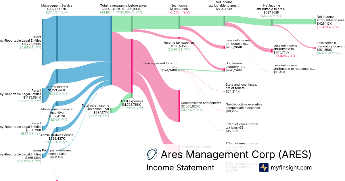 For the year ending 2025-12-31, ARES made $5,601,482K in revenue. $426,112K in net income. Net profit margin of 7.61%.
