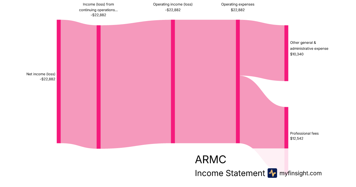 For the quarter ending 2024-09-30, ARMC made $22,882 in revenue. -$22,882 in net income. Net profit margin of -100.00%.