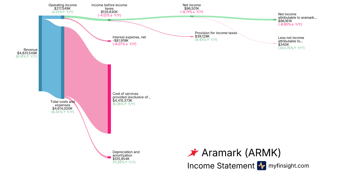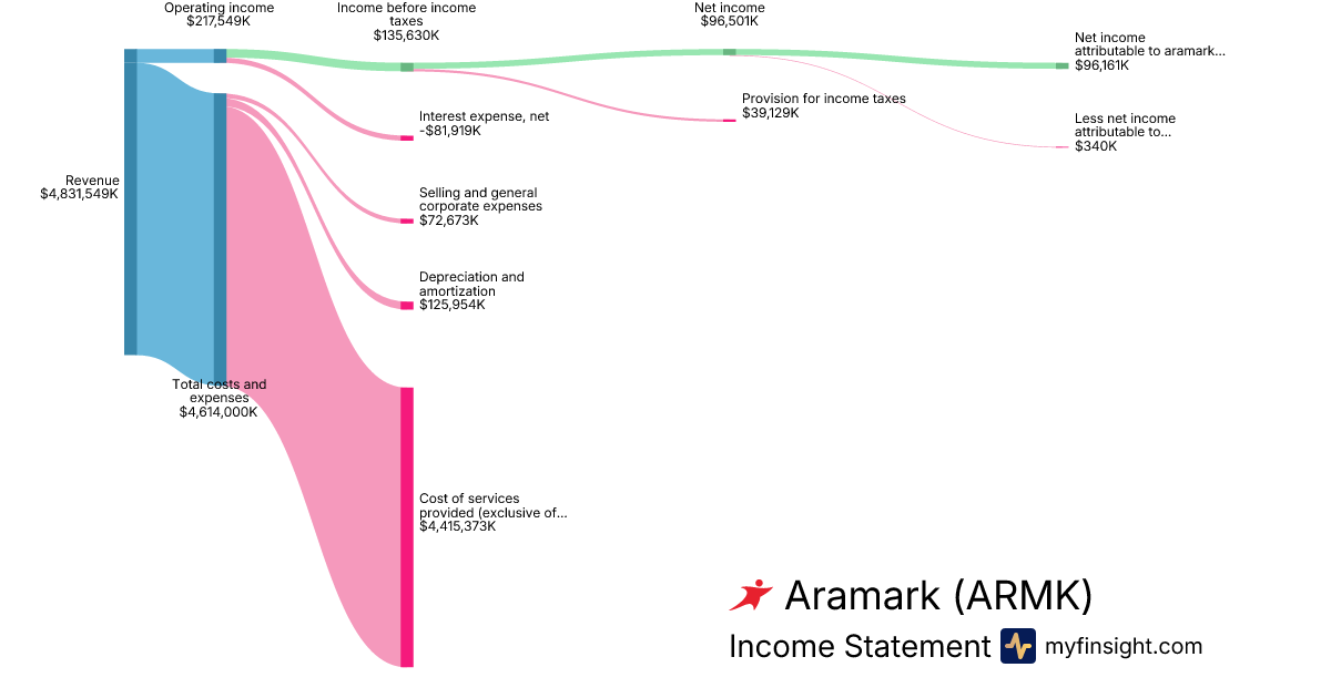 For the quarter ending 2026-01-02, ARMK made $4,831,549K in revenue. $96,161K in net income. Net profit margin of 1.99%.