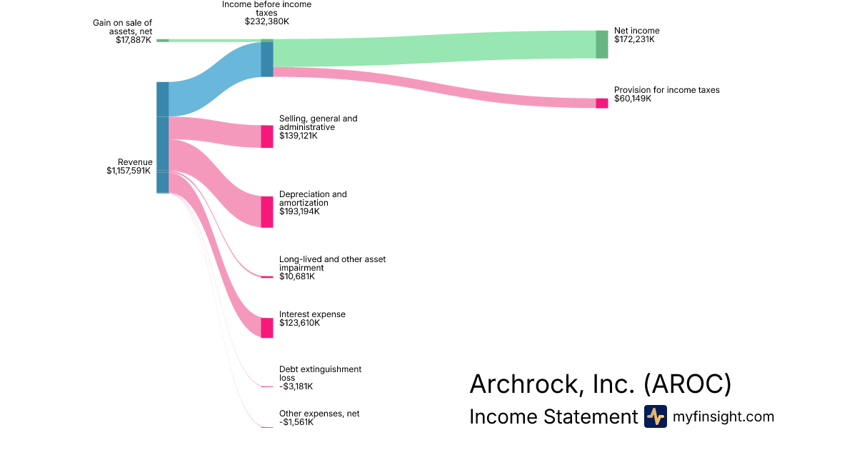 For the year ending 2024-12-31, AROC made $1,157,591K in revenue. $172,231K in net income. Net profit margin of 14.88%.