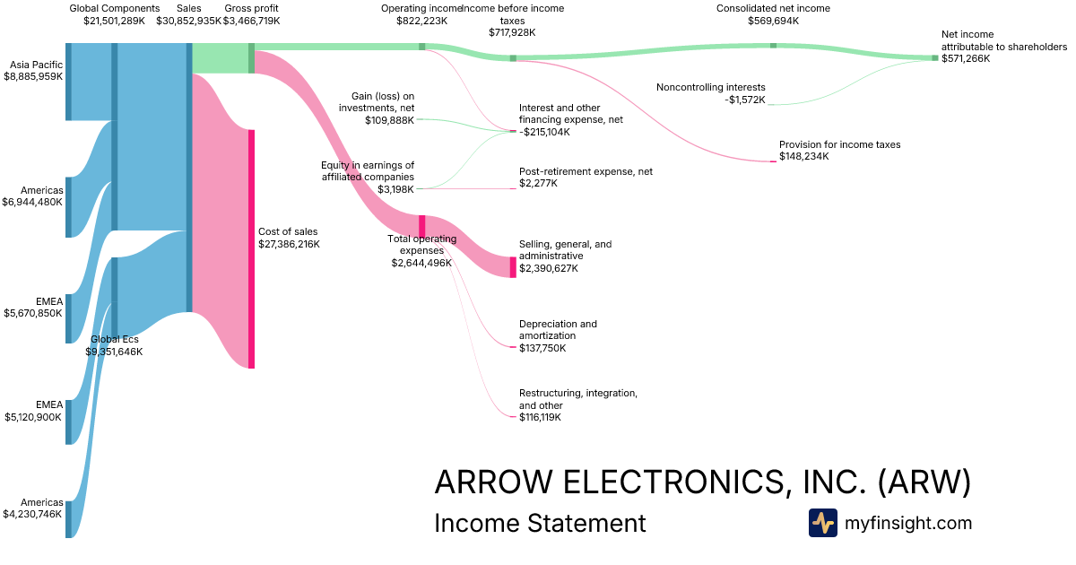 For the year ending 2025-12-31, ARW made $30,852,935K in revenue. $571,266K in net income. Net profit margin of 1.85%.