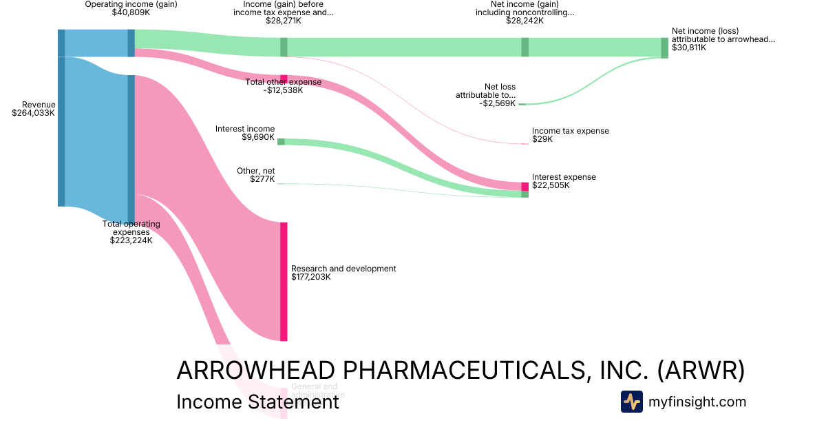 For the quarter ending 2025-12-31, ARWR made $264,033K in revenue. $30,811K in net income. Net profit margin of 11.67%.