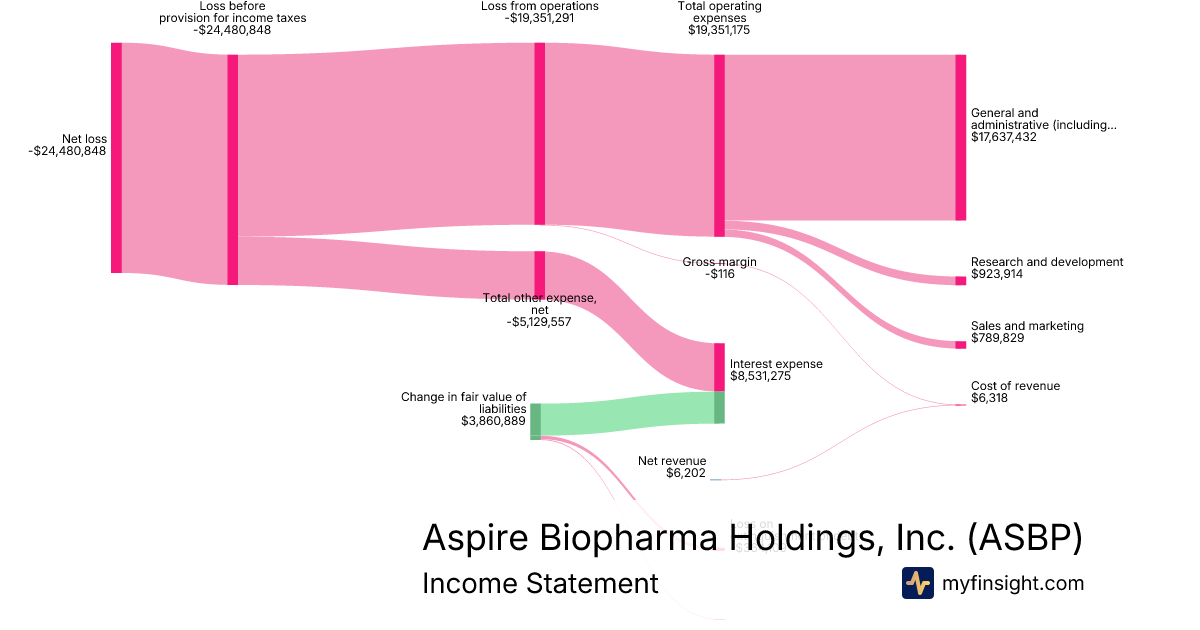 For the year ending 2025-12-31, ASBP made $6,202 in revenue. -$24,480,848 in net income. Net profit margin of -394725.06%.