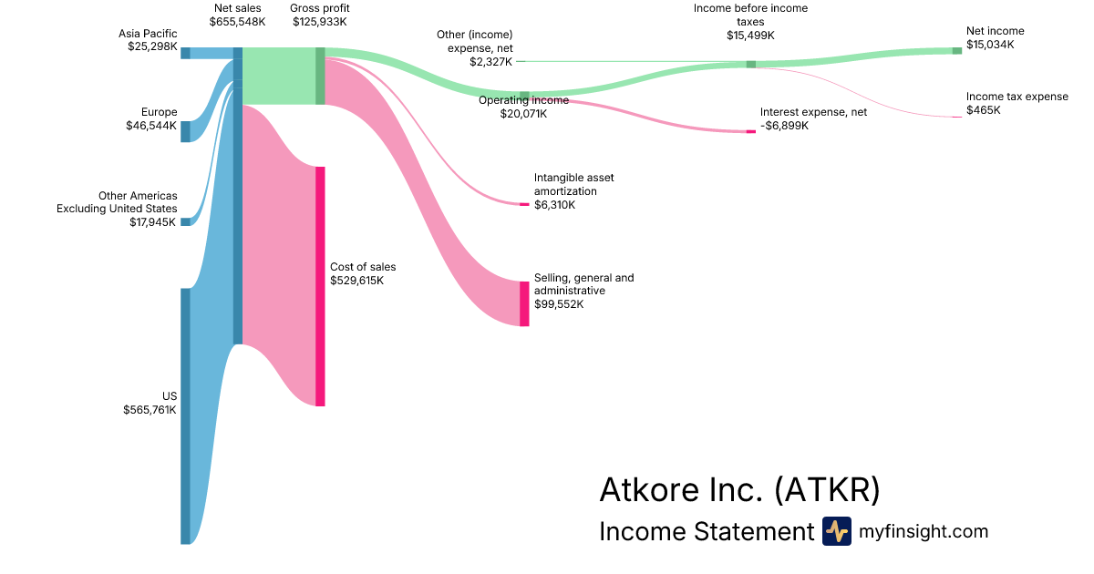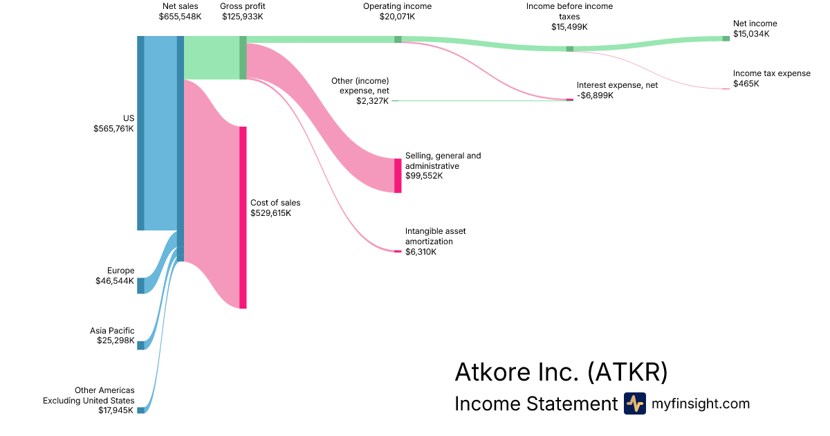 For the quarter ending 2025-12-26, ATKR made $655,548K in revenue. $15,034K in net income. Net profit margin of 2.29%.