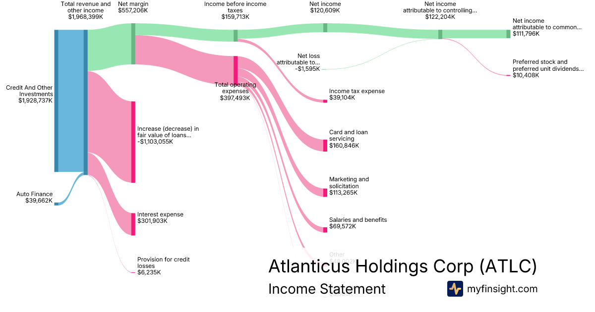 For the year ending 2025-12-31, ATLC made $1,968,399K in revenue. $111,796K in net income. Net profit margin of 5.68%.