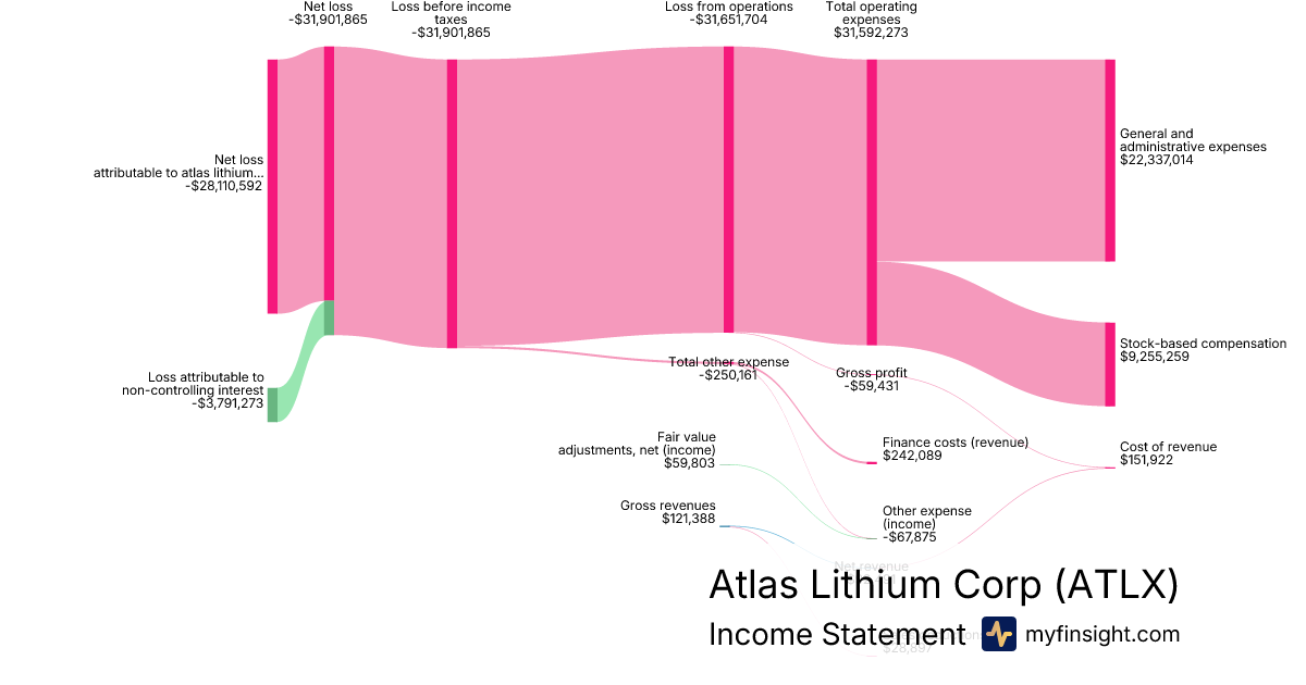 For the year ending 2025-12-31, ATLX made $92,491 in revenue. -$28,110,592 in net income. Net profit margin of -30392.79%.