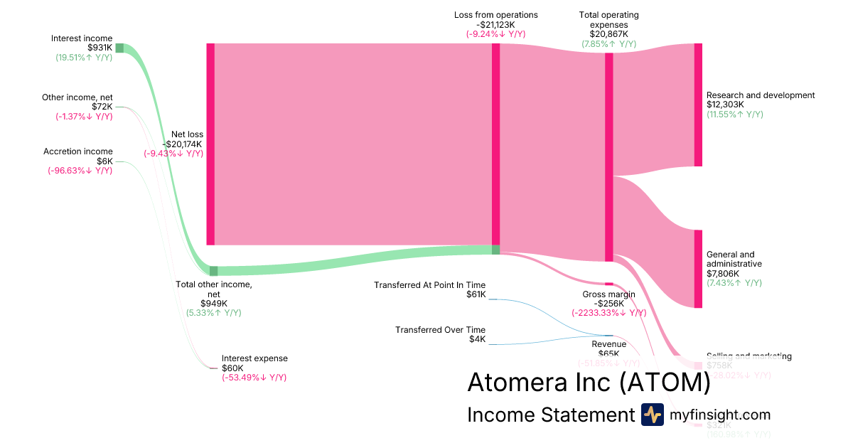 For the year ending 2025-12-31, ATOM made $65K in revenue. -$20,174K in net income. Net profit margin of -31036.92%.