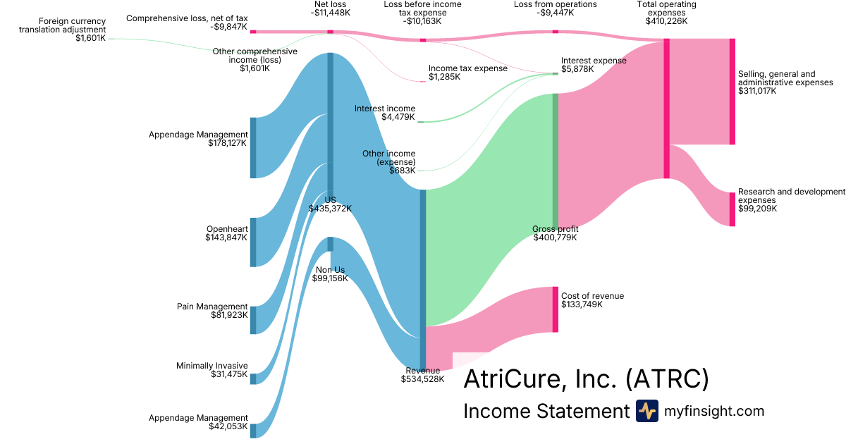 For the year ending 2025-12-31, ATRC made $534,528K in revenue. -$9,847K in net income. Net profit margin of -1.84%.
