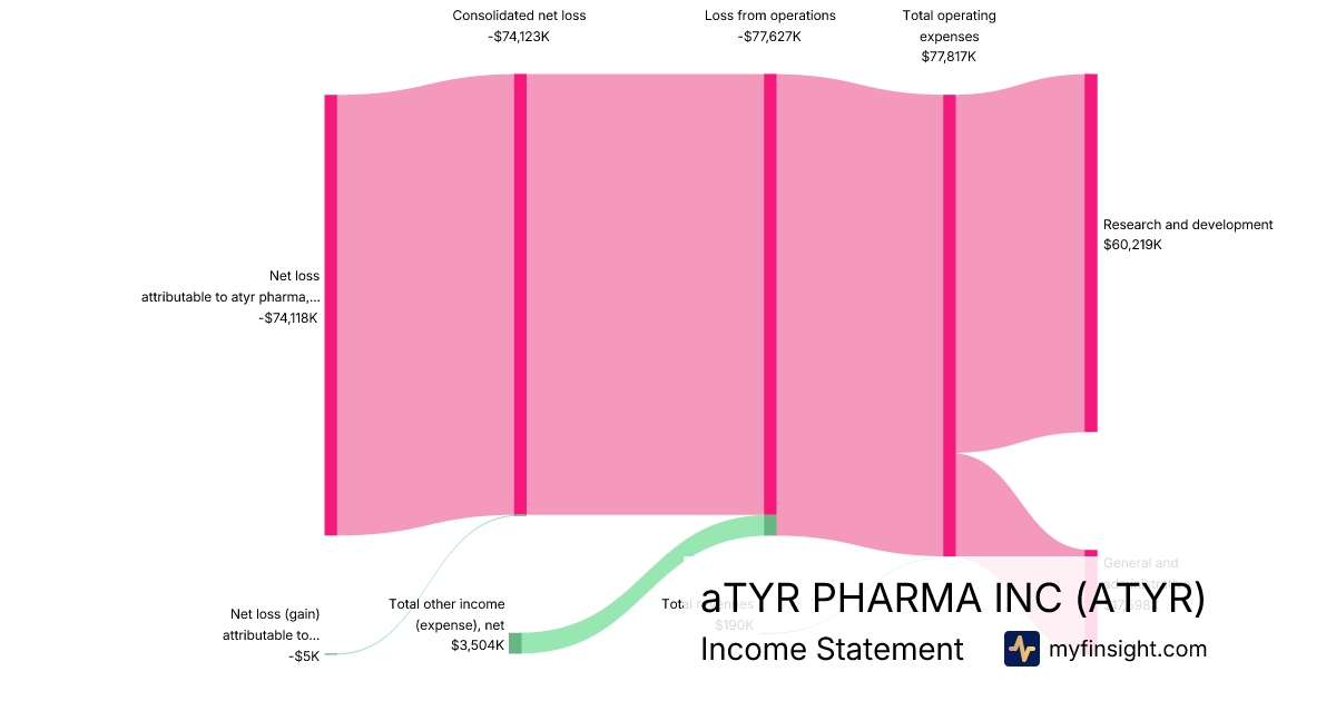 For the year ending 2025-12-31, ATYR made $190K in revenue. -$74,118K in net income. Net profit margin of -39009.47%.