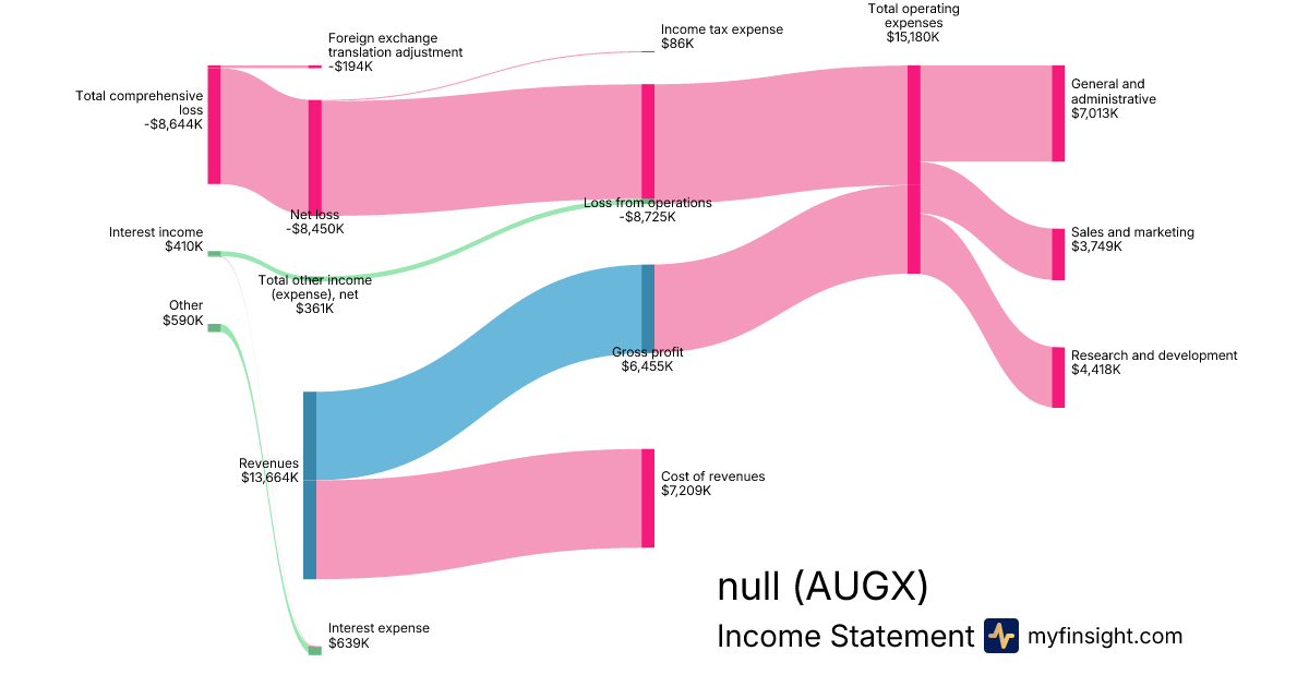 For the quarter ending 2024-06-30, AUGX made $13,664K in revenue. -$8,644K in net income. Net profit margin of -63.26%.