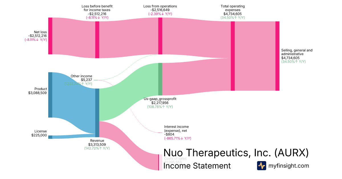 For the year ending 2025-12-31, AURX made $3,313,509 in revenue. -$2,512,216 in net income. Net profit margin of -75.82%.