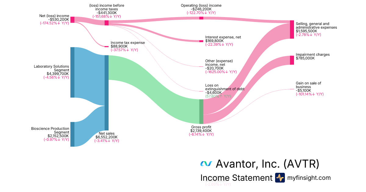 For the year ending 2025-12-31, AVTR made $6,552,200K in revenue. -$530,200K in net income. Net profit margin of -8.09%.