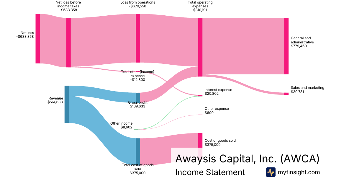 For the quarter ending 2025-12-31, AWCA made $514,633 in revenue. -$683,358 in net income. Net profit margin of -132.79%.