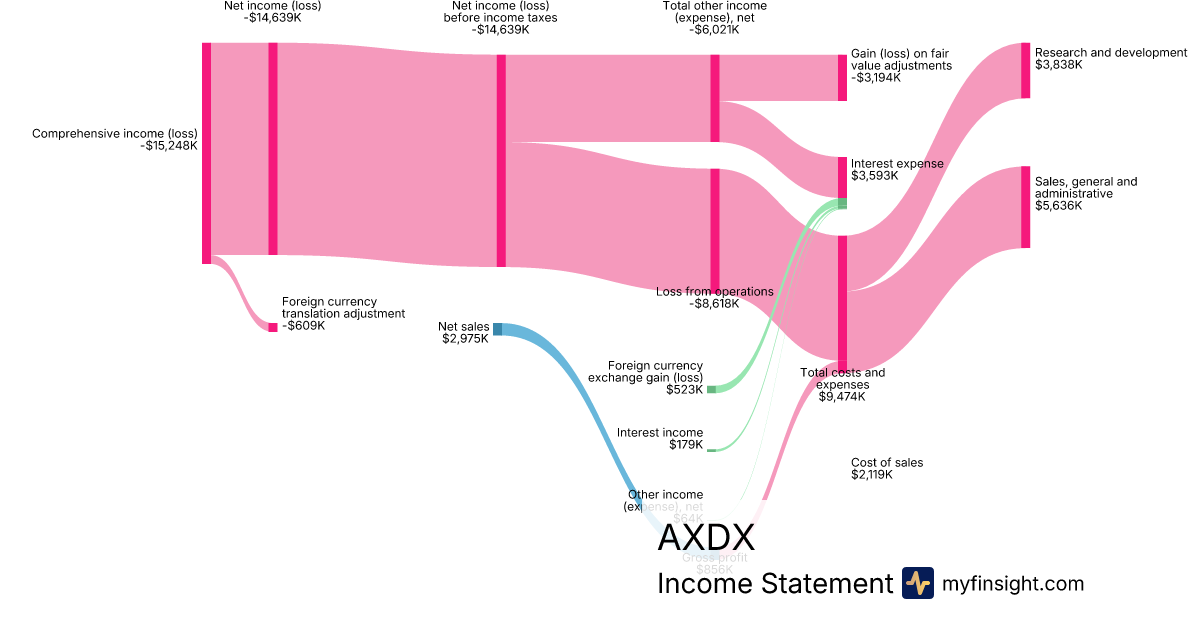 For the quarter ending 2024-09-30, AXDX made $2,975K in revenue. -$15,248K in net income. Net profit margin of -512.54%.