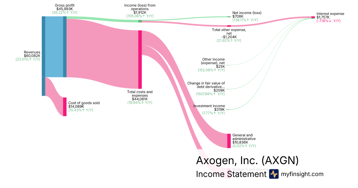 For the quarter ending 2025-09-30, AXGN made $60,082K in revenue. $708K in net income. Net profit margin of 1.18%.