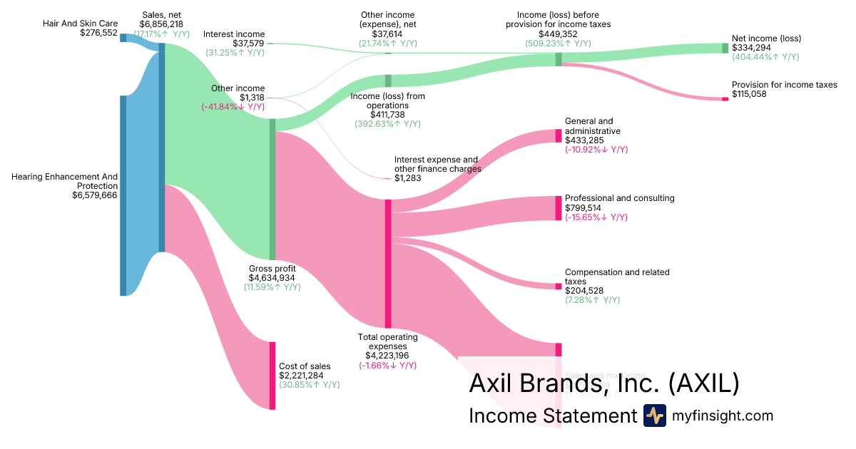 For the quarter ending 2025-08-31, AXIL made $6,856,218 in revenue. $334,294 in net income. Net profit margin of 4.88%.