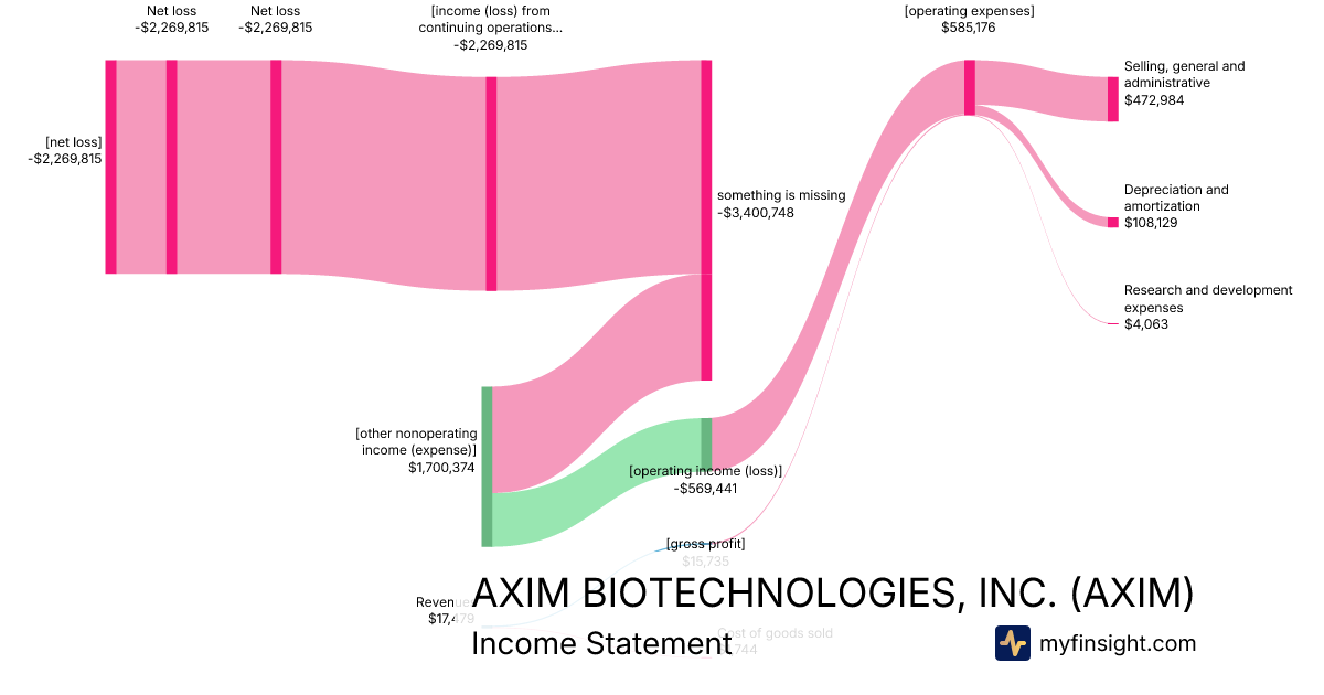 For the quarter ending 2024-06-30, AXIM made $17,479 in revenue. -$2,269,815 in net income. Net profit margin of -12985.95%.