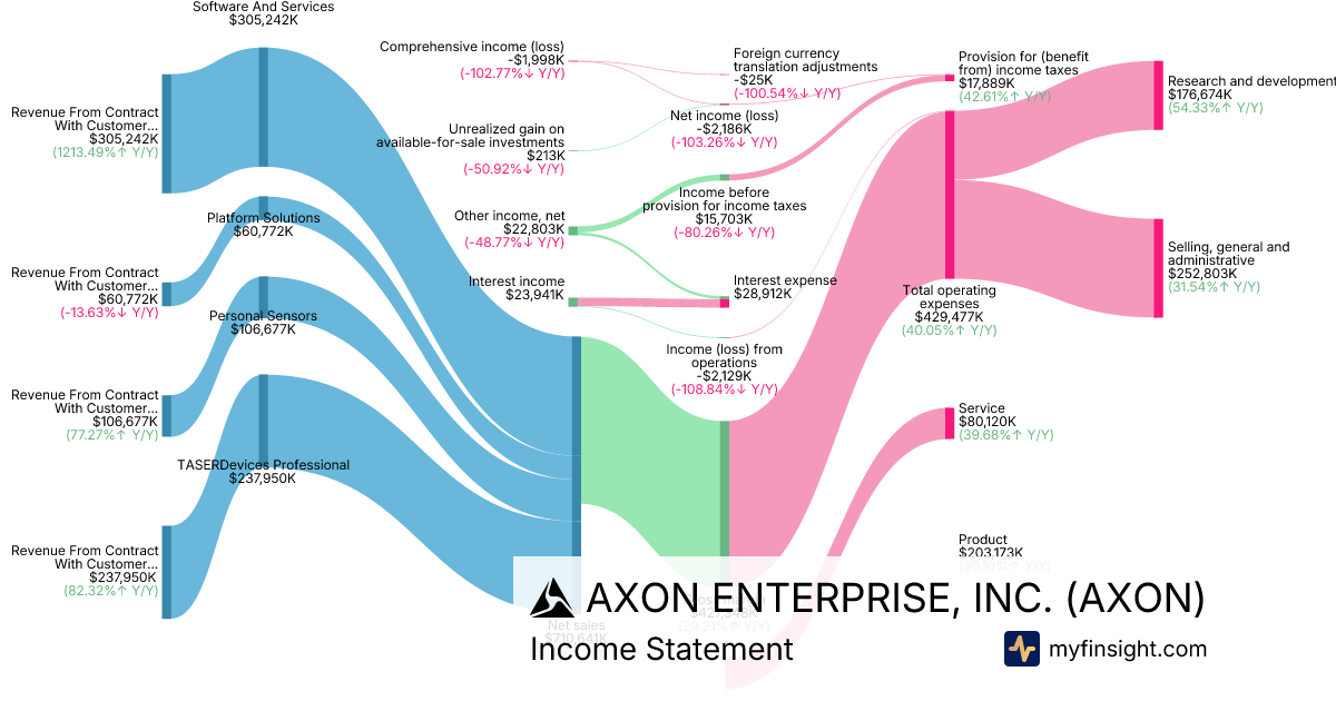 For the quarter ending 2025-09-30, AXON made $710,641,000 in revenue. -$1,998,000 in net income. Net profit margin of -0.28%.