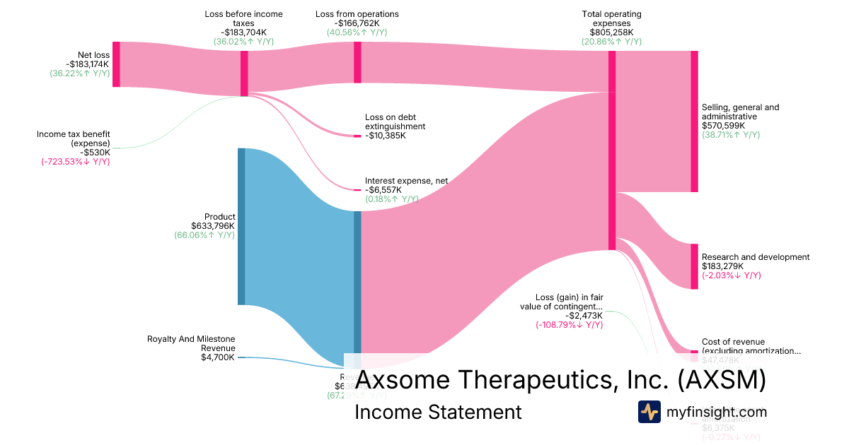 For the year ending 2025-12-31, AXSM made $638,496K in revenue. -$183,174K in net income. Net profit margin of -28.69%.