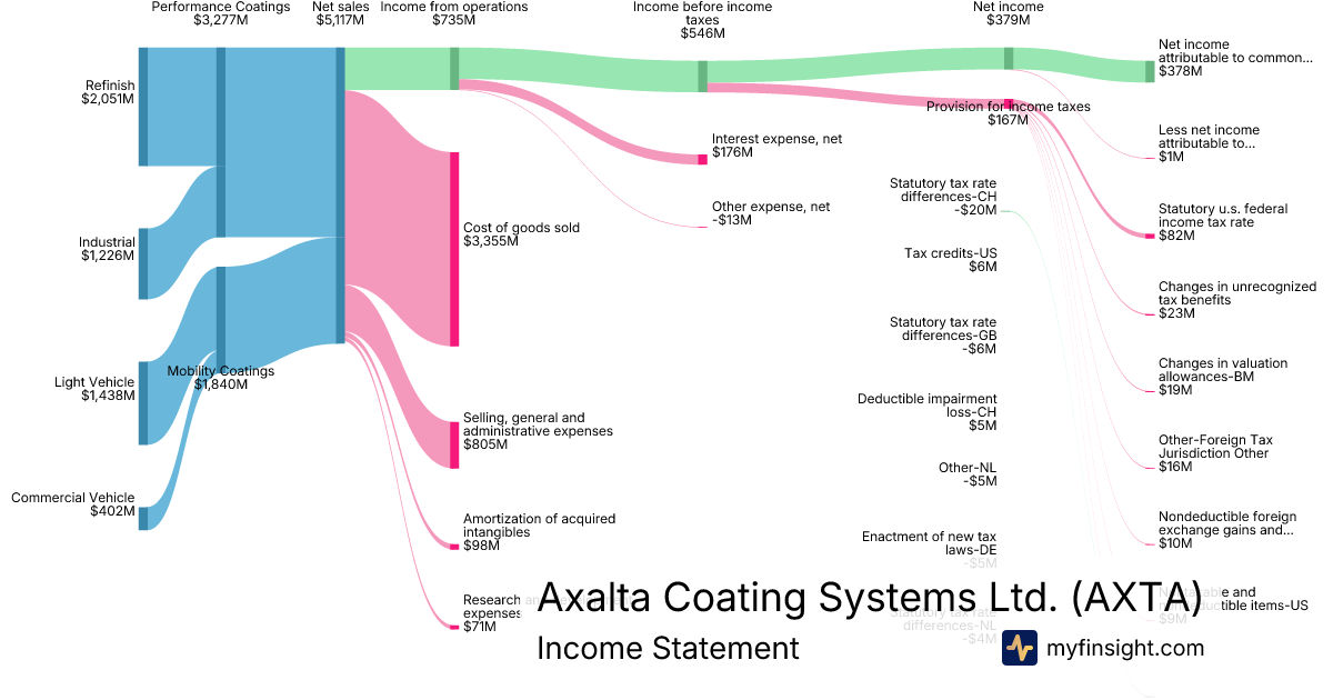 For the year ending 2025-12-31, AXTA made $5,117M in revenue. $378M in net income. Net profit margin of 7.39%.