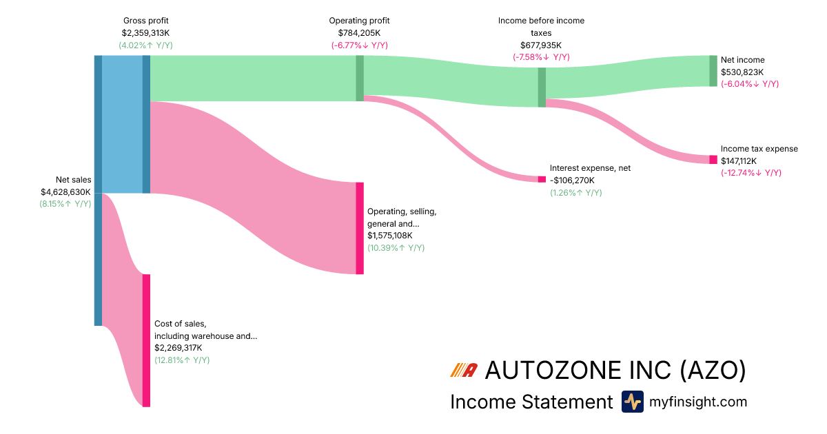 For the quarter ending 2025-11-22, AZO made $4,628,630K in revenue. $530,823K in net income. Net profit margin of 11.47%.